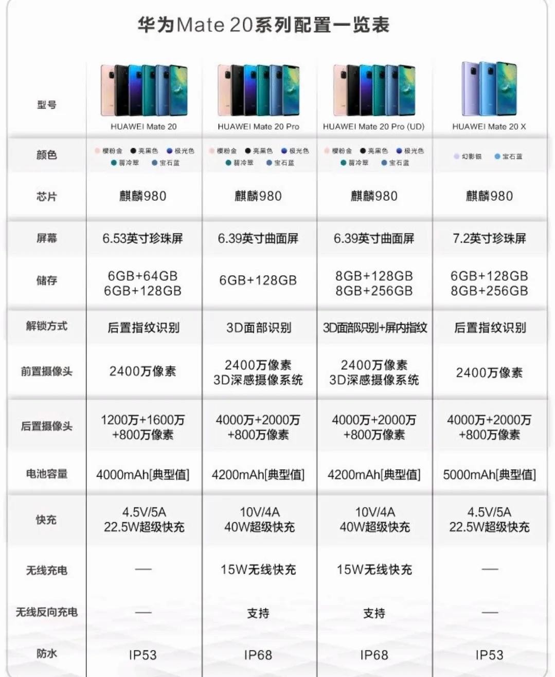 在解锁方式上,Mate20Pro将Mate20的后置指纹解锁升级成了屏幕指纹解锁和3D人脸识别解锁。Mate20Pro配备4200毫安的电池和40瓦的快充、15瓦的无线充,并且华为在Mate20Pro上面就已经使用了反向无线充电,IP68防水也具备,全能的Mate20Pro在当时算的上是“机皇”级别的手机了。但不知不觉中,mate20Pro已经发布了六年了,也快进入淘汰边缘了。