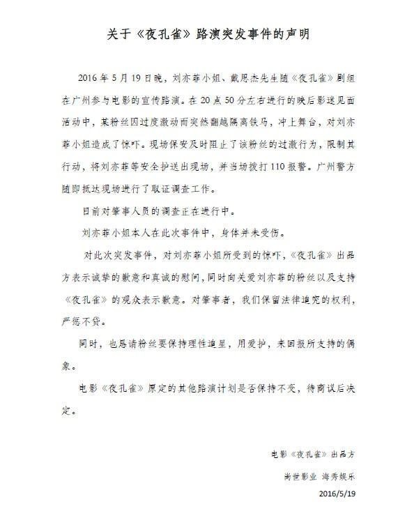 今晚,刘亦菲在广州参加新片《夜孔雀》影迷见面会,跟粉丝互动过程中,被一男子猛扑倒在地!据网友爆料称此男已跟踪刘亦菲好多次!成都商报客户端记者从剧组方面获悉,刘亦菲暂无大碍。一位剧组工作人员表示,“她腿部受伤了,但是很坚强,后天还要去武汉。”据介绍,目前刘亦菲已经回酒店休息,这名不理智的粉丝已经被警察带走。