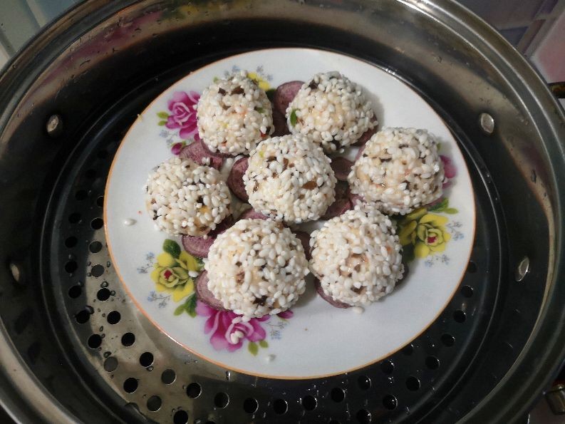 6. 取出一大勺肉馅,用手团成丸子,然后在滤水后的糯米上滚一圈,让丸子均匀沾上糯米,然后放到盘子里的紫薯片上,把做好的珍珠丸子一个个都码放好;