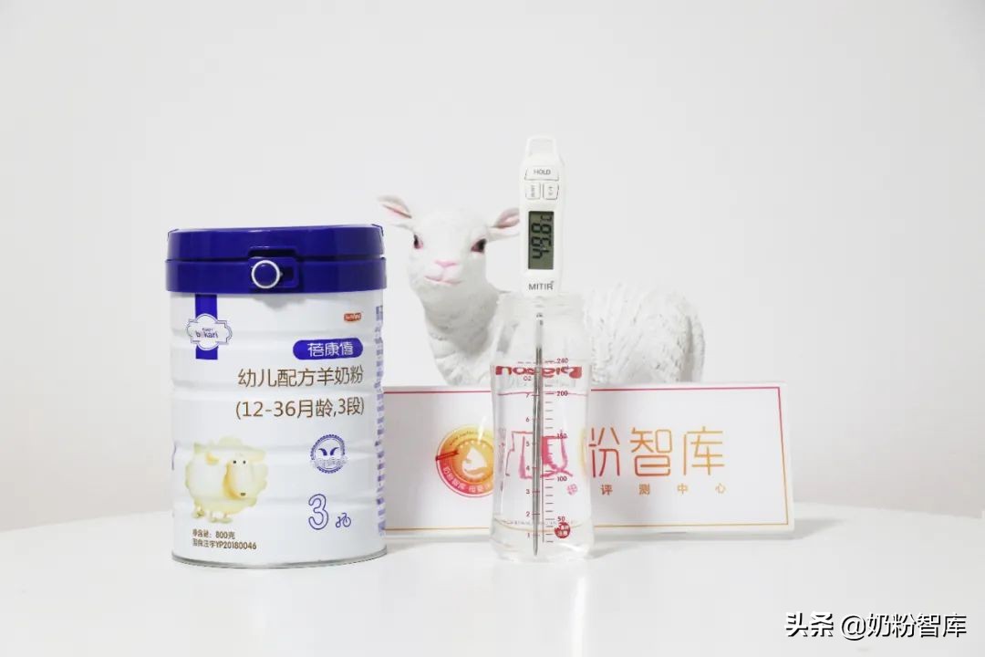 对于蓓康僖羊奶粉,按照奶粉冲调说明(罐体建议水温45℃~50℃左右),我们采用专属的“仿真冲调标准”进行评测,先取240ml冷却至49.8℃的开水后,再取8平勺奶粉冲调。