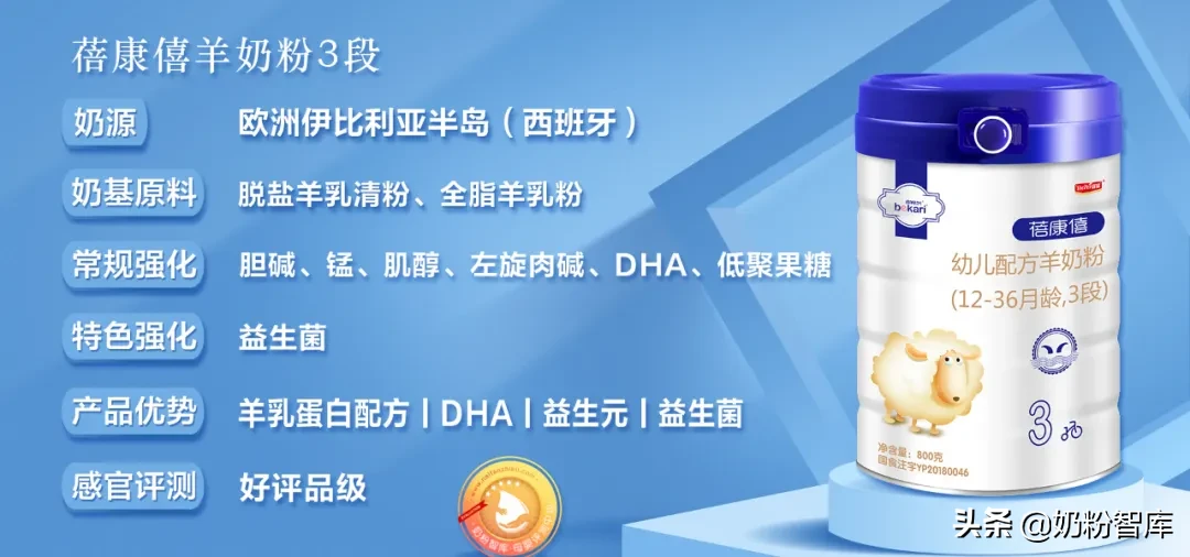 综合来看,蓓康僖采用欧洲伊比利亚半岛(西班牙)的优质奶源。主要奶基原料采用脱盐羊乳清粉、全脂羊乳粉,由脱盐羊乳清粉提供乳糖和羊乳蛋白。