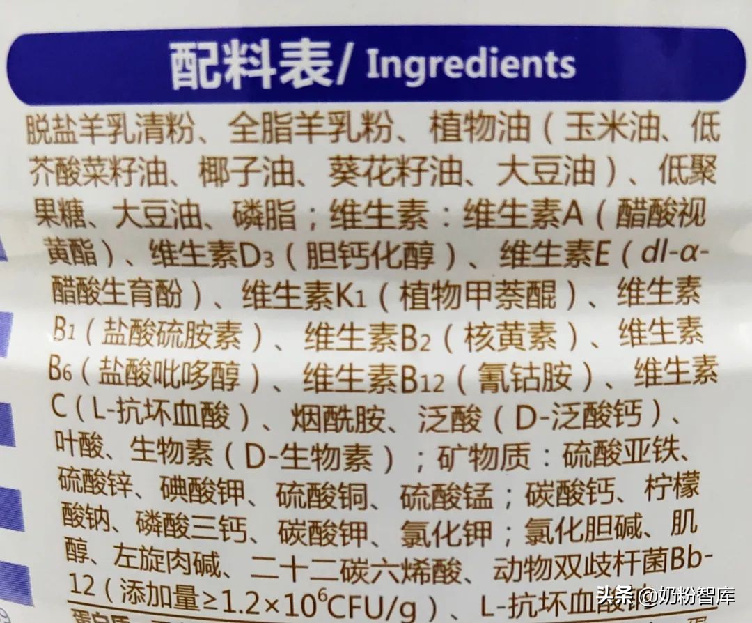 从其配料表来看,主要奶基原料采用脱盐羊乳清粉、全脂羊乳粉,并且由脱盐羊乳清粉提供乳糖和羊乳蛋白,没有额外添加乳糖。
