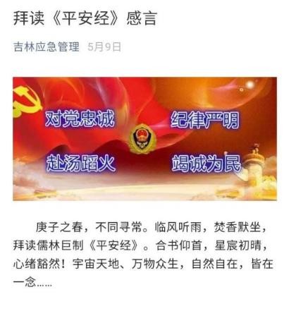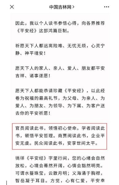 此外,先后有“中国吉林网“”“吉林应急管理”等多家吉林省当地官方微信公众号为这本《平安经》背书,发表了所谓的“拜读《平安经》感言”的文章,并且在文末向读者隆重推荐《平安经》,宣称“官员阅读此书,领悟初心使命。学者阅读此书,顿悟平安哲理。商贾阅读此书,企业平安无虞。民众阅读此书,安享世间太平。”