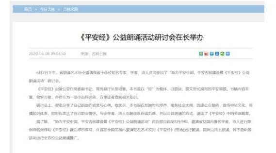 《吉林日报》也发表了关于“《平安经》公益朗诵活动研讨会”的新闻通稿,并且被吉林省人民政府新闻办公室转载。