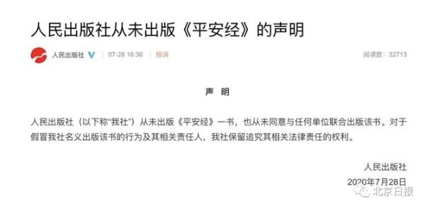 28日下午,人民出版社在其官方微博发布一则声明,否认出版《平安经》