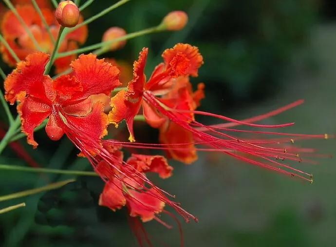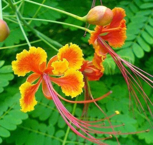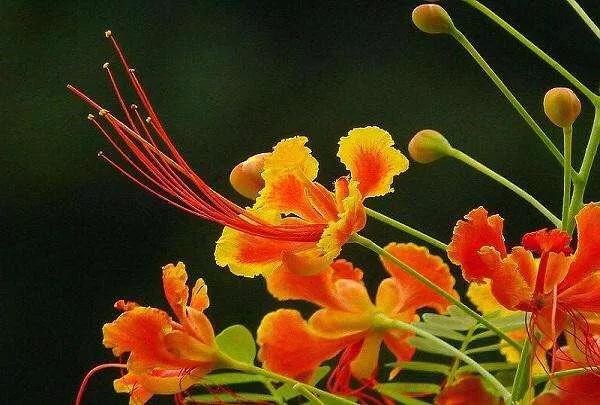 金凤花,豆科云实属常绿大灌木或乔木;高达3米,花冠橙红色,边缘金黄色,如火焰蝴蝶般常年盛开于枝头。为热带地区有价值的观赏树木之一。