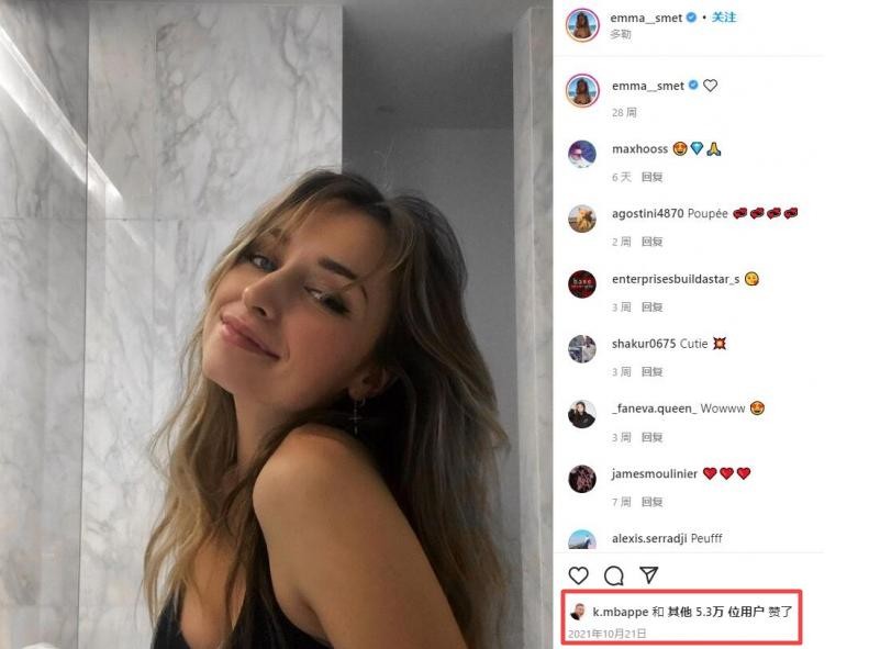 另外一个证据是,姆巴佩在社交媒体上,经常给Emma Smet的动态点赞,这也说明两人的关系并不一般。