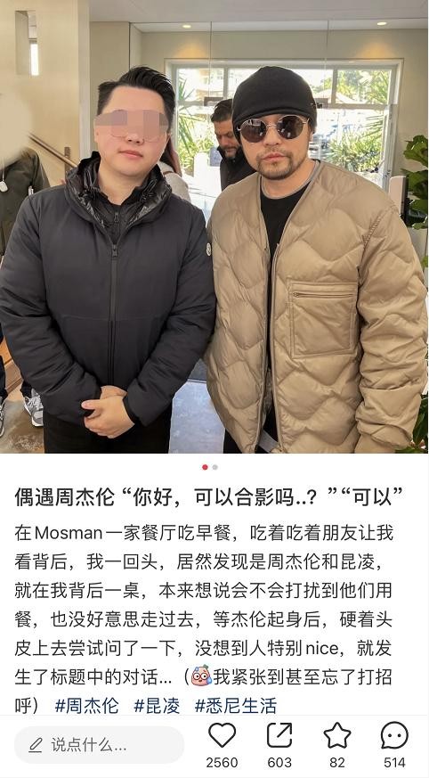 在粉丝的透露中,表示当天正在悉尼的某家餐厅和朋友吃饭,吃得正香的时候,朋友让他回头去看背后,结果这不看不要紧,一看吓一跳,竟然是全民偶像周杰伦,而且身边还有他的妻子昆凌,就在他的背后,本来不想打扰的,也不好意思,但是就在这时周杰伦起身,当事人就硬着头皮上去问了一下,没想到就同意了,这可把粉丝高兴坏了,跟周董来了张合影。