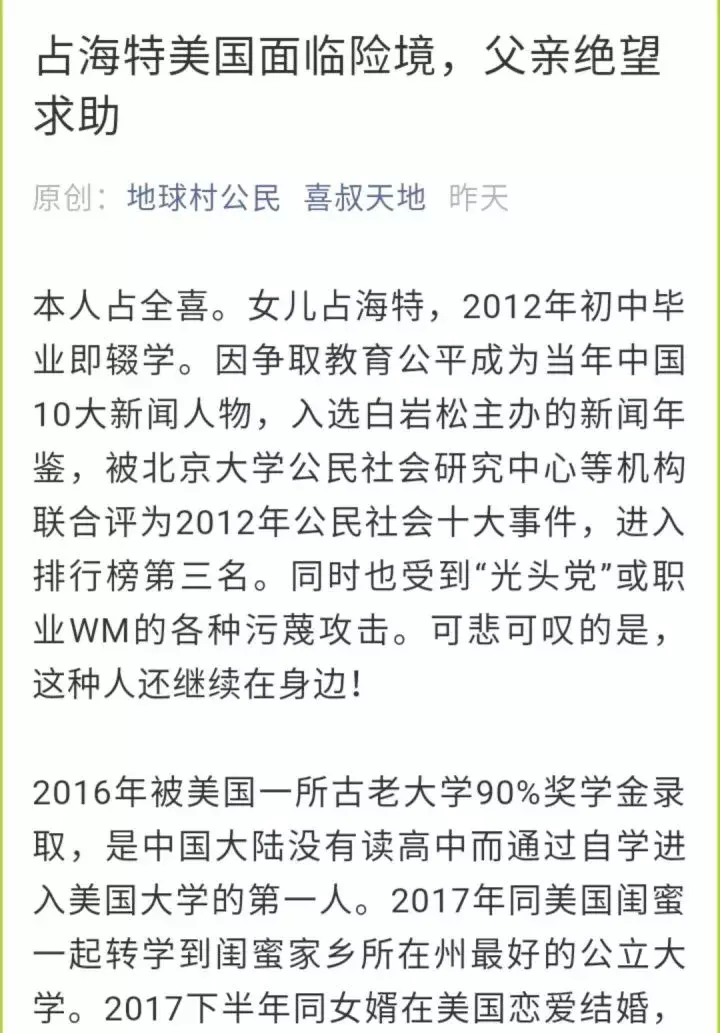 没成想,从今年3月9号开始,占全喜突然在个人微信号上连发三篇文章,说20岁的占海特在美读书期间结婚生子,受到据称是“党员干部女教授”的公婆虐待,患上严重的产后抑郁,拒绝吃药,在美国欠下一二十万美元的天价医疗账单。