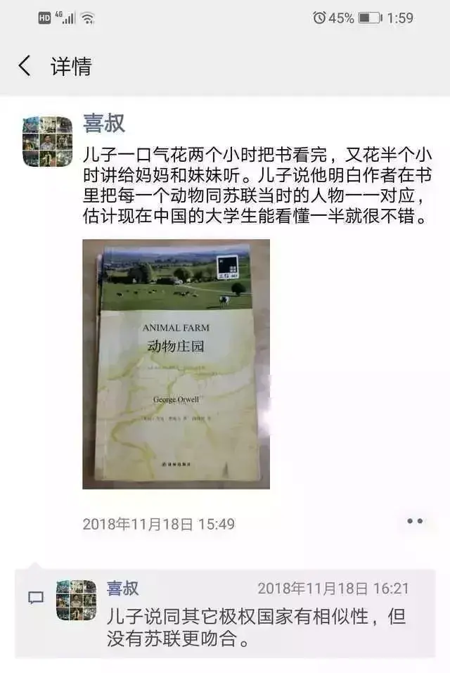 占全喜曾在自己朋友圈里炫耀,说小儿子两个小时读完《动物庄园》,对妈妈和妹妹讲,这书是在跟苏联这样的集权国家、当时的人物一一对应,这样的原生家庭,叫人不寒而栗。