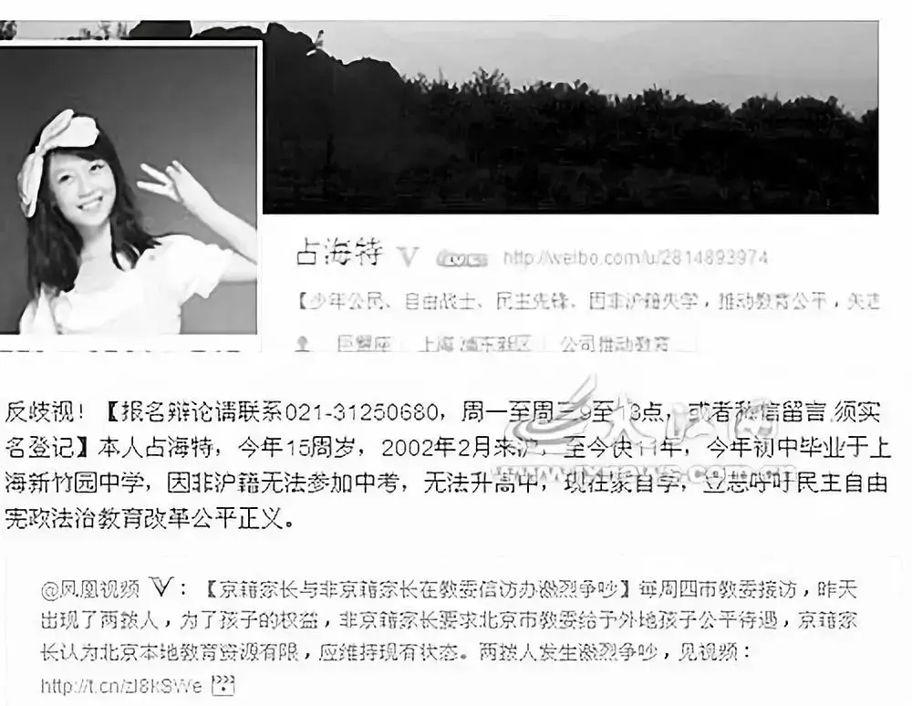当时,许多中外媒体以“公民”称赞占海特。她自己的微博简介也是“少年公民、自由战士,因非沪籍失学、推动教育公平”。