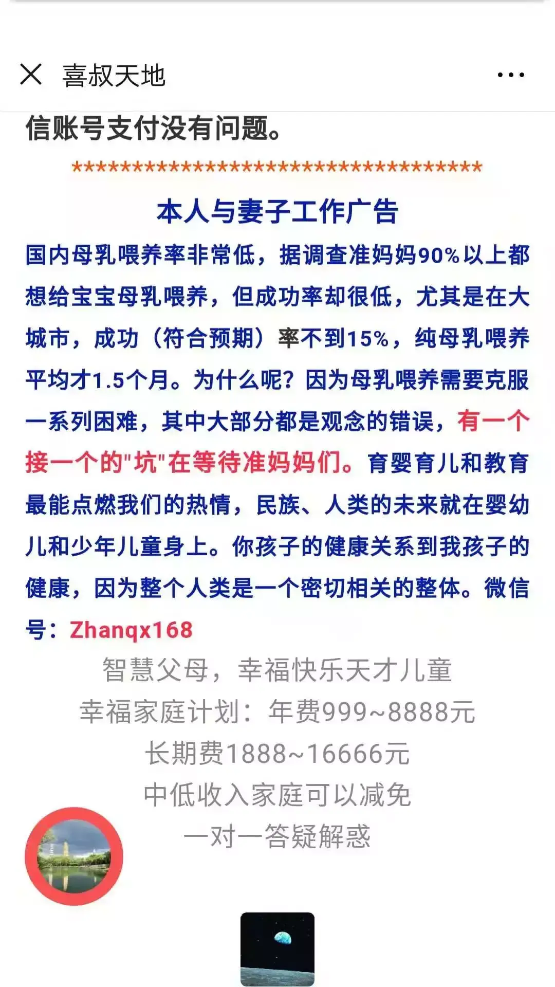 就在17日推送的文章“孩子,我是个卑微的父亲”中,占全喜历数占海特从小到大受到多少家庭宠爱,后来又是多么发奋学习,而自己因为支持占海特教育平权,成了国家的罪人,某些势力的眼中钉,因此他要尽到父亲的责任,把筹到的钱5年还完。下面,占全喜诡异地话锋一转,贴出一则他和妻子的工作广告,母乳喂养和智慧父母天才儿童幸福家庭计划,年费收999~8888元,长期费1888~16666元,加占全喜个人微信,一对一答疑解惑。
