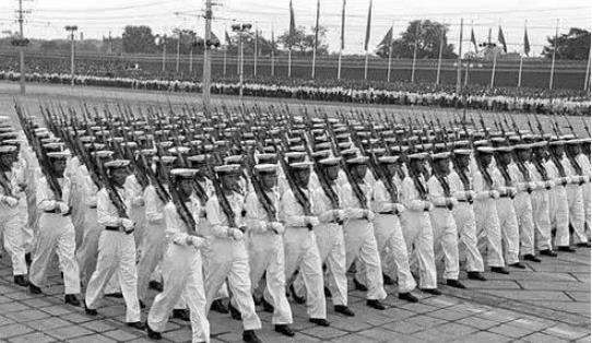 1955年国庆阅兵,是中国人民解放军实行军衔制后的首次阅兵。受阅官兵全部着新式军服,佩戴军衔、领章。军衔制的实行,标志着人民解放军在现代化、正规化方面有了新发展。此次阅兵出现了将军领队,受阅官兵们意气风发,精神抖擞,迈着铿锵有力的步伐接受检阅。