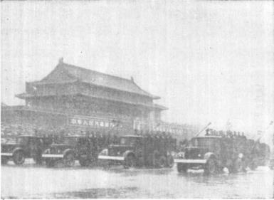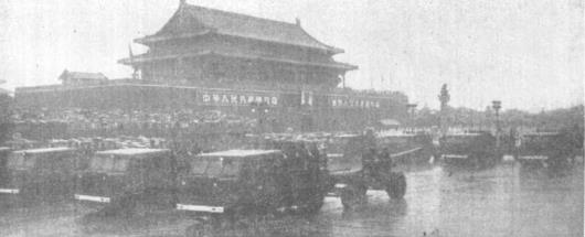 1952年10月1日,中国人民解放军摩托化部队经过天安门广场。(资料图片)