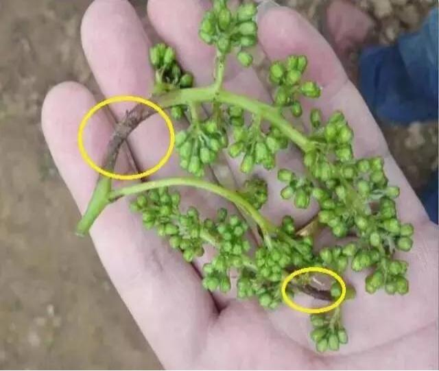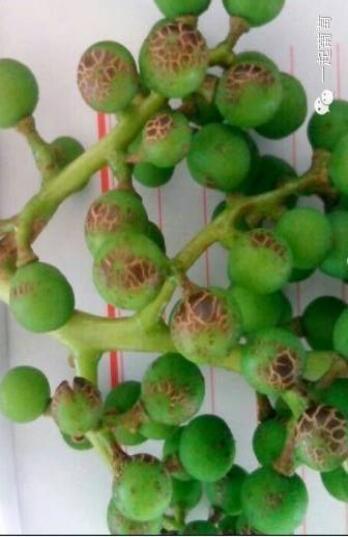 下图是溃疡,总在不经意间到来,果粒没事,果梗干枯。上果之前一定先侵染枝条,这时候要注意观察枝条,抑霉唑,金霉唑,辛菌胺,咪鲜胺都有不错的效果