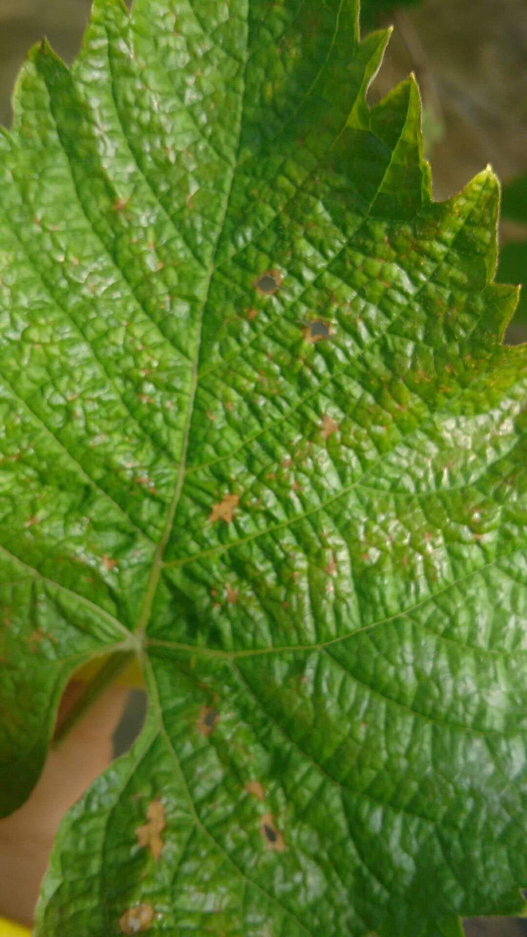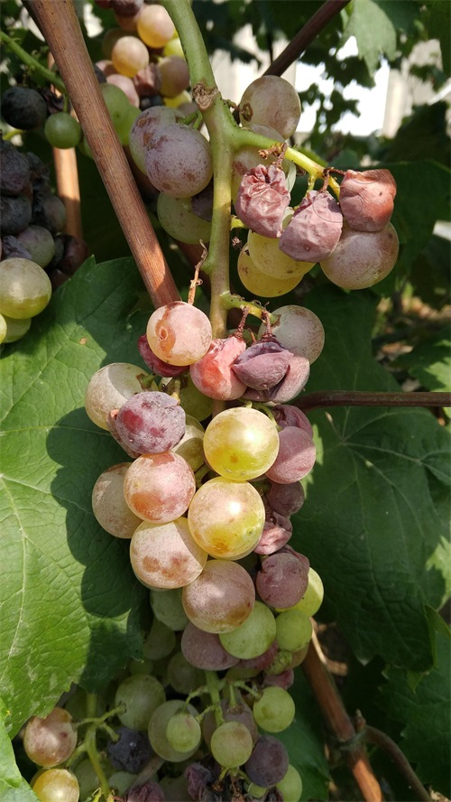 没老化好的中等枝条先感染。慢慢侵染叶片和果穗,叶片上有V字病斑,果穗腐烂。