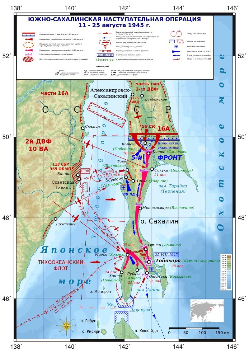 然而,8月11日在苏军进攻南库页岛的时候,人数是日军3倍的苏军遭到了日军的顽强抵抗,进展甚微。8月15日,日本宣布投降并命令除必要的自卫战斗外,停止一切战斗。然而,驻守在南库页岛的日军司令樋口季一郎两次违背命令,继续与苏军进行死守作战。直到8月25日,苏军才完全占领库页岛。8月18日,苏军进攻千岛群岛,9月1日占领整个千岛群岛。