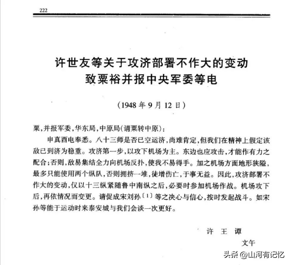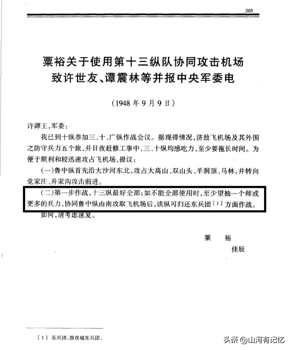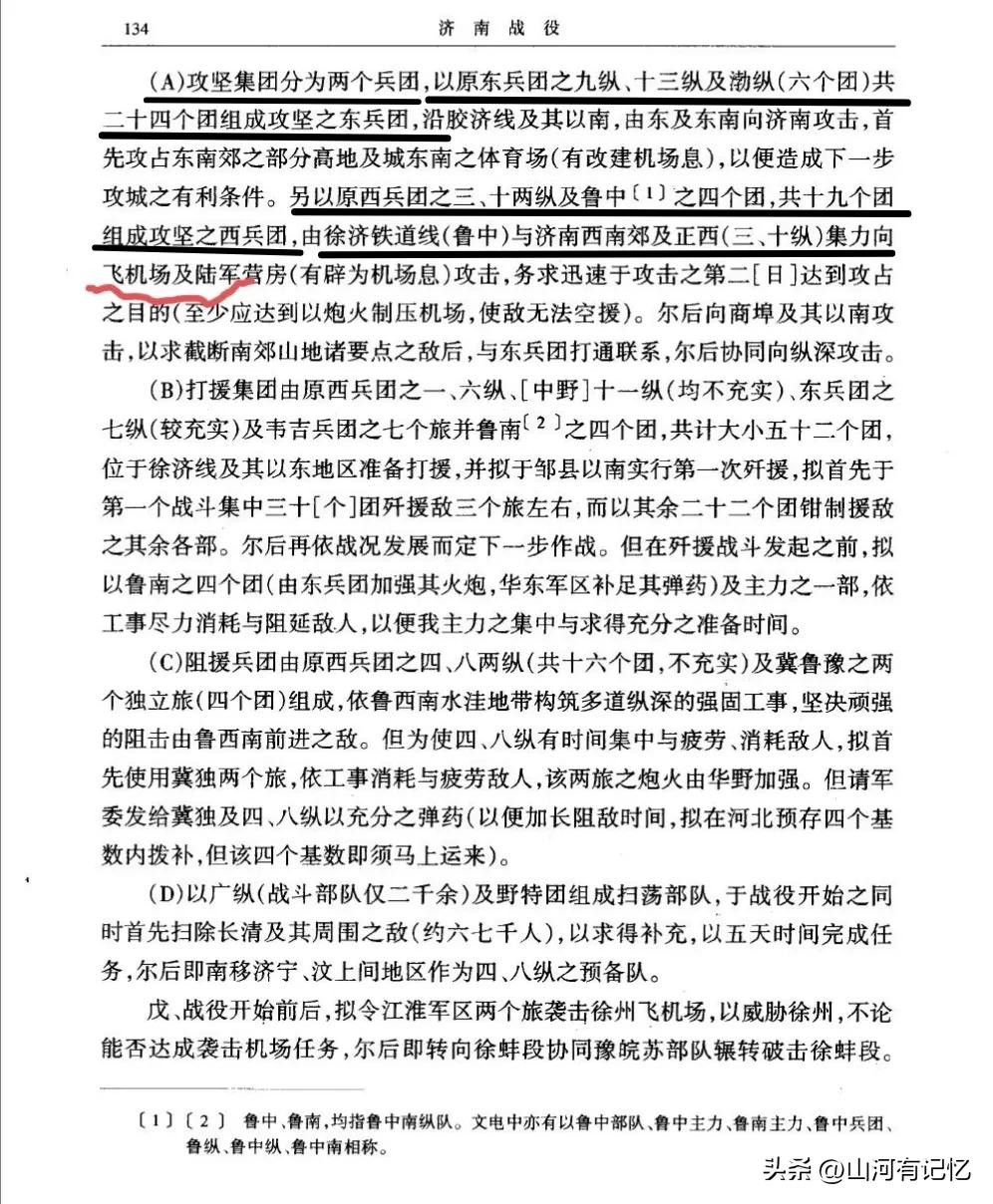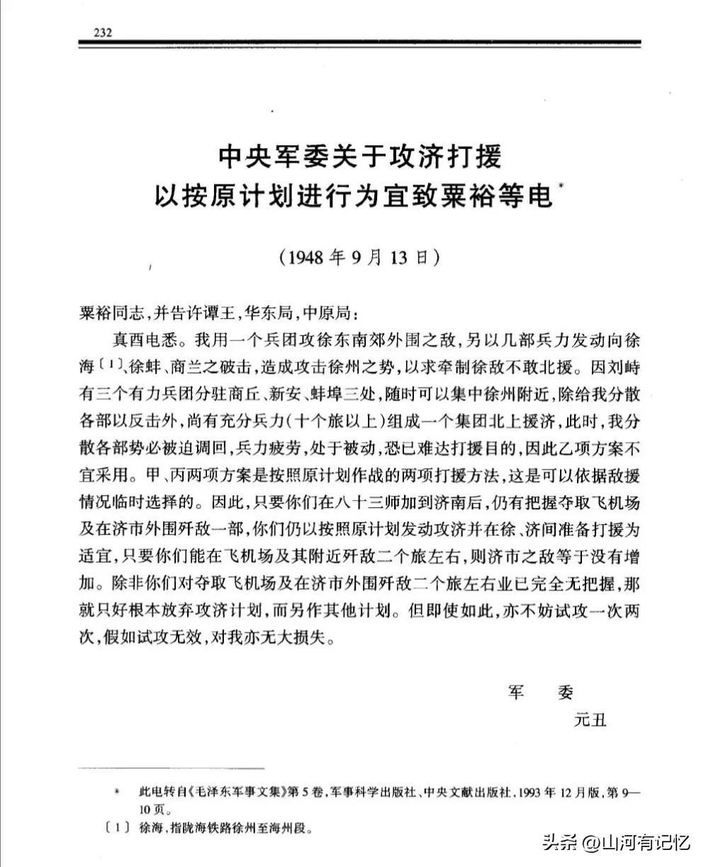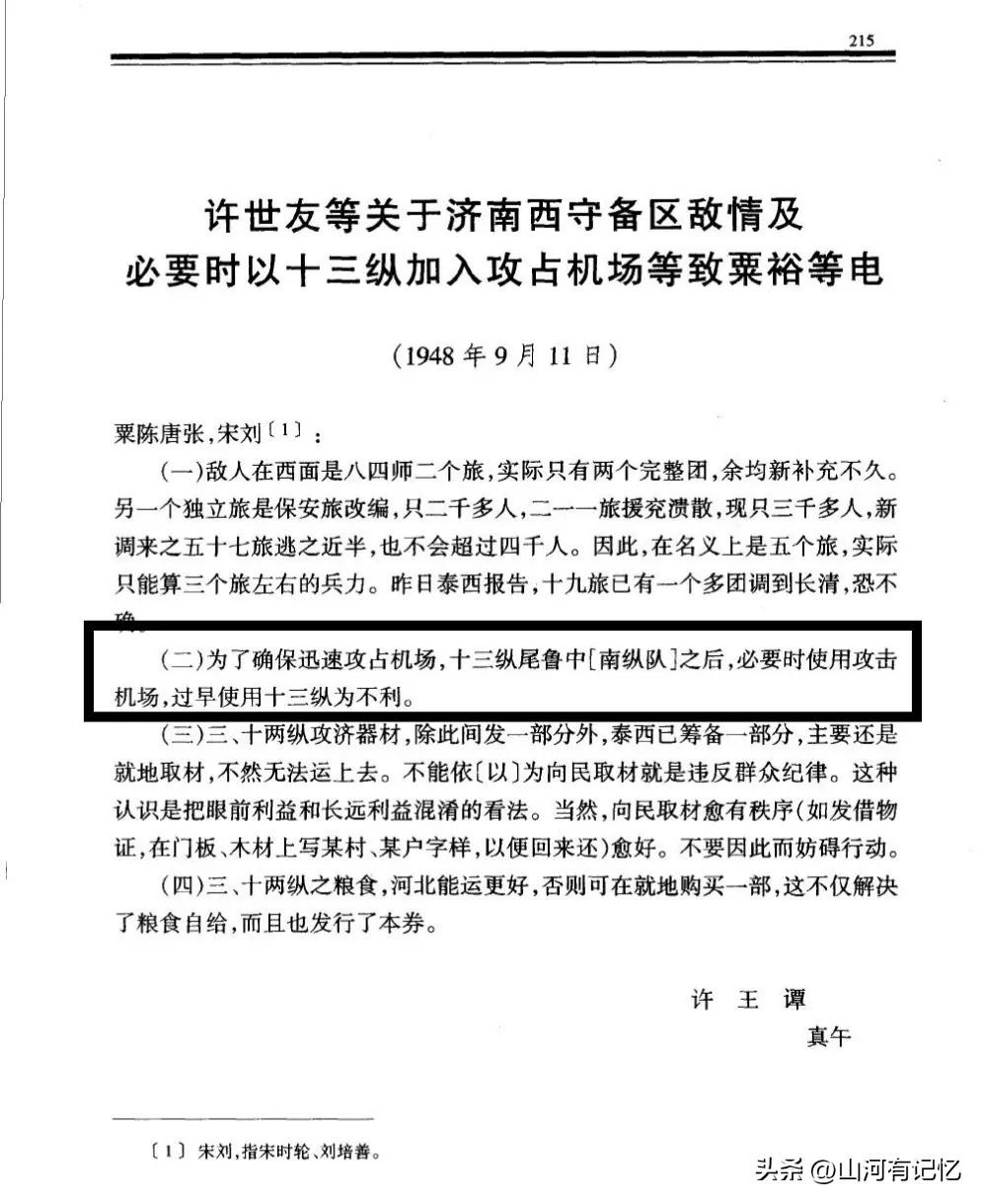 再然后,就是何新引用的“因此,攻济部署不作大的变动”,可后边接的是“仅以十三纵紧随鲁中南纵之后,必要时参加机场作战。”上下文一串,也不像反驳,反倒是……