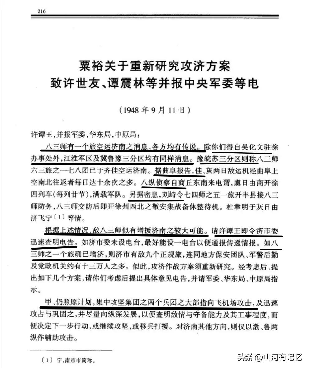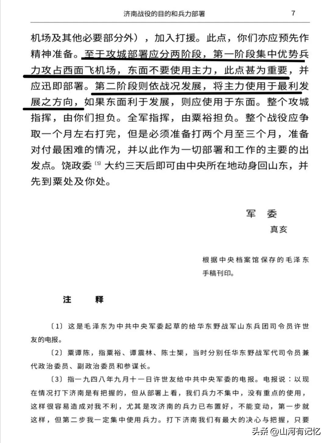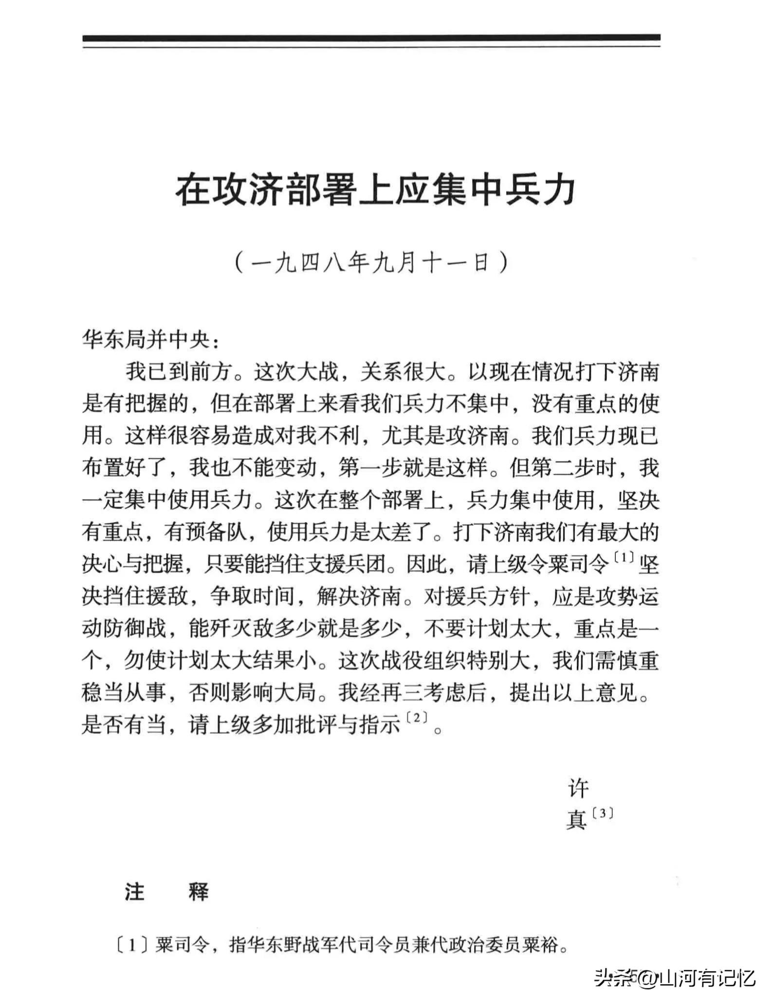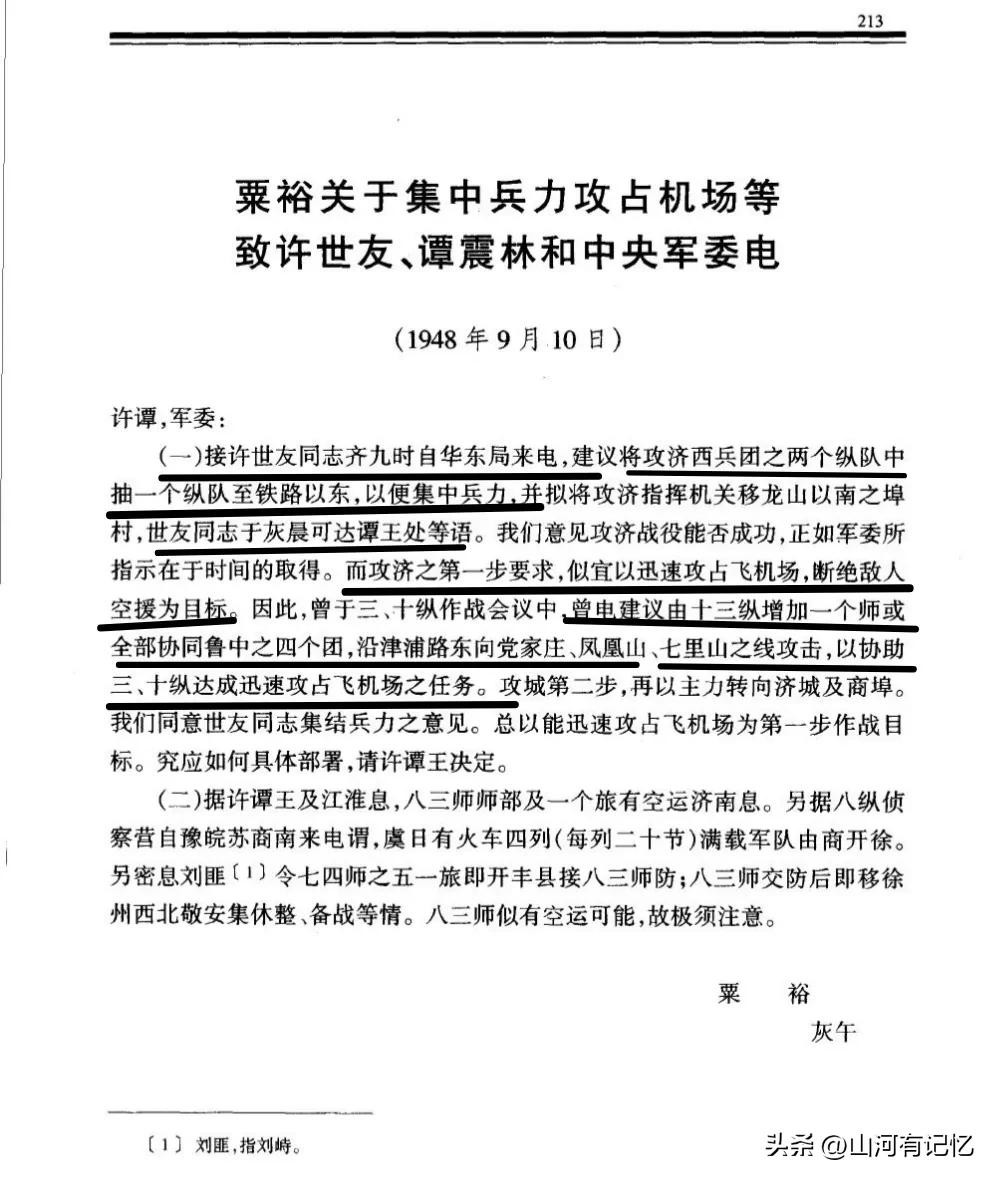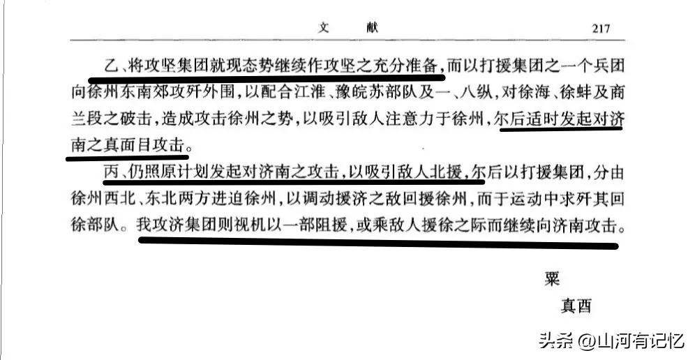 再然后,就是何新引用的“因此,攻济部署不作大的变动”,可后边接的是“仅以十三纵紧随鲁中南纵之后,必要时参加机场作战。”上下文一串,也不像反驳,反倒是……