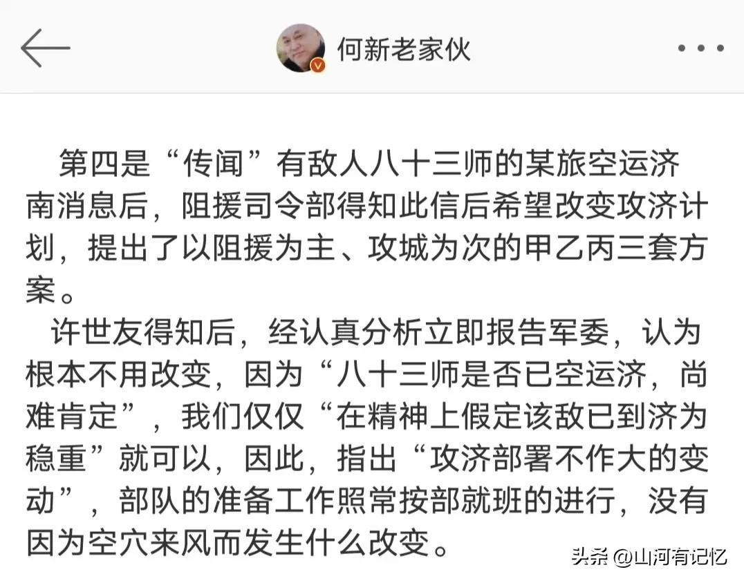 何新把许世友建议的“为了确保迅速攻占机场,十三纵尾鲁中南纵队之后,必要时使用攻击机场,过早使用十三纵为不利.”,称为是战役的神来之笔。