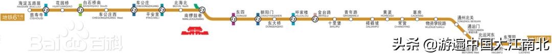 北京地铁6号线(Beijing Subway Line 6),是中国北京市区第15条开通的线路,于2012年12月30日开通运营一期工程(海淀五路居站至草房站)[1],于2014年12月30日开通运营二期工程(草房站至潞城站)[2],于2018年12月30日开通运营西延伸段(海淀五路居站至金安桥站)[3],标志色为土黄色。截至2018年12月,北京地铁6号线全长52.9千米,共设34座车站,全部为地下车站,采用8节编组准B型列车