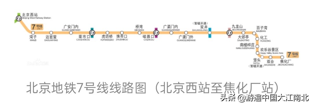 据2019年9月北京地铁官网显示,北京地铁7号线呈东西走向,线路西起北京西站,途经西城区广安门、东城区广渠门、朝阳区欢乐谷景区等地,东至环球度假区站。