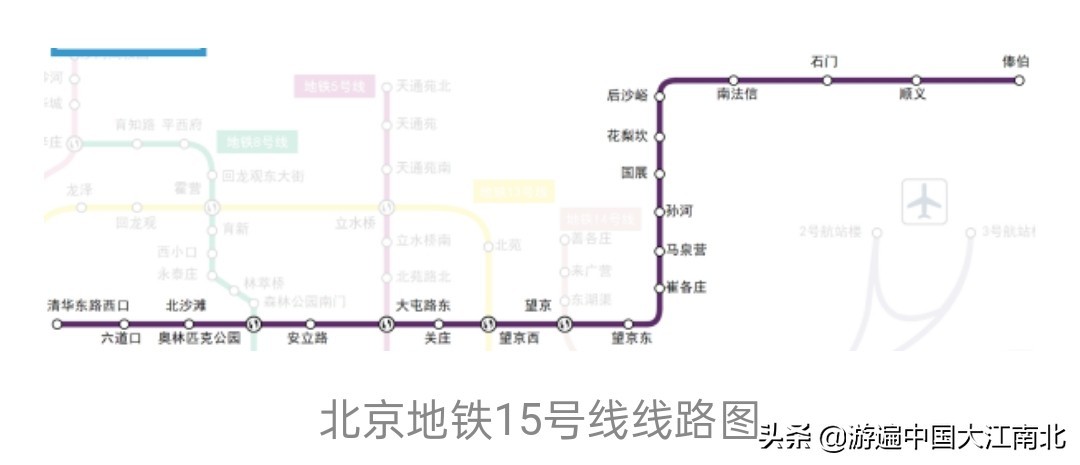 北京地铁15号线(Beijing Subway Line 15),是中国北京市第十条建成运营的地铁线路,于2010年12月30日开通运营一期首通段(望京西站至后沙峪站),[1]于2011年12月31日开通运营一期东段(后沙峪站至俸伯站),[2]于2014年12月28日开通运营一期西段(望京西站至清华东路西口站),[3]并先后开通大屯路东站、望京东站,[4][5][6]标志色为紫
