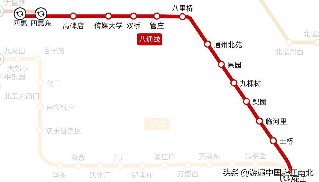 北京地铁八通线(Beijing Subway Ba Tong Line),是中国北京市第四条建成运营的地铁线路,于2001年12月30日开工建设,[1]于2003年12月27日开通运营一期工程(四惠站至土桥站),[2][3]于2019年12月28日开通运营南延工程一期(土桥站至花庄站),[4]标志色为红色。
