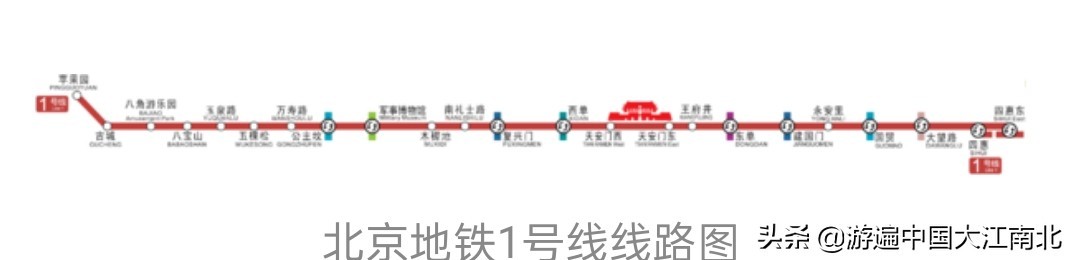 据2019年10月北京地铁官网显示,北京地铁1号线自西向东经石景山区、经海淀区、西城区、东城区至朝阳区,呈一条直线行驶。该线西起苹果园站,东至四惠东站。