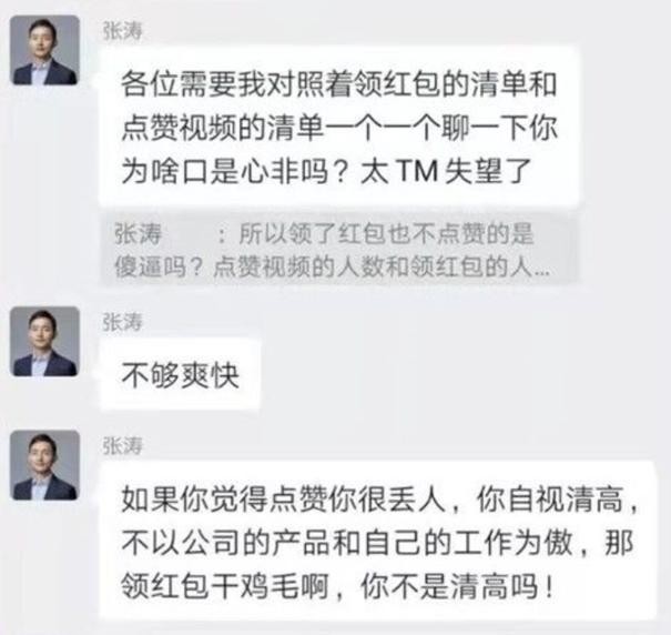 此番言论一石激起千层浪,有的网友认为这位公司领导的格局太小,也有认证为员工的网友爆料该公司至今仍存在问题,扩员十倍后又在年初裁员近千人。无论如何,张涛做出的这番发言都不得体不合时宜,对员工提出的“拿了红包就要点赞”要求也超出了原本的工作内容。