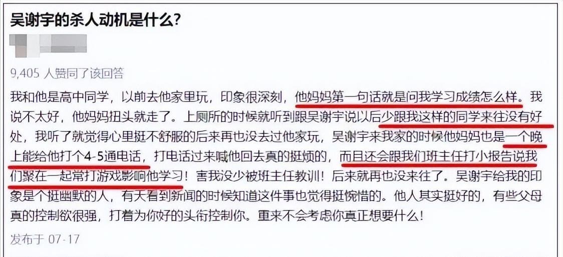 谢天琴控制欲很强,限制吴谢宇的自由,从小到大都生活在这种管制下,导致吴谢宇生出了叛逆的心理