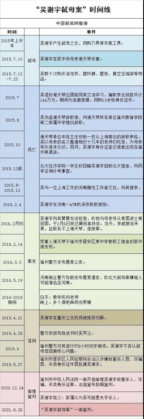 2021年8月,吴谢宇因故意杀人、诈骗、买卖身份证件,被法院判处死刑,剥夺政治权利终身。