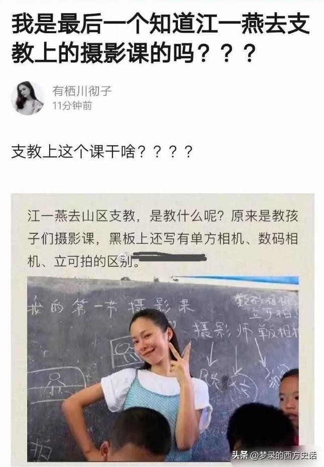 细心的网友还扒出江一燕在山区支教时,教的却是摄影,山区的孩子哪里有钱买相机。