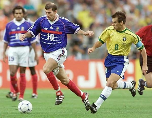 1998世界杯,齐达内用两记头球帮助法国队战胜强大的巴西队。图为齐达内(左)在决赛中带球