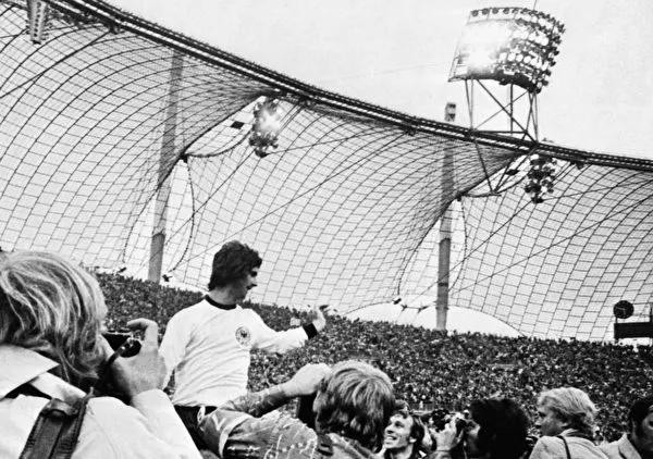 1974年世界杯决赛,穆勒打入致胜进球。图为穆勒赛后被队友举起庆祝