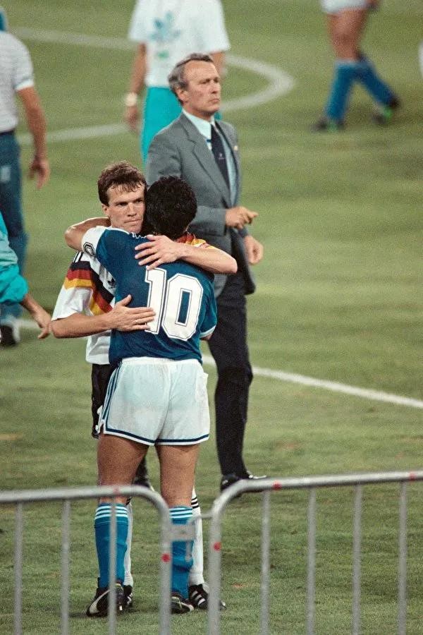 球场上马特乌斯是马拉多纳的一生之敌,球场下二人惺惺相惜。图为1990世界杯决赛后,二人拥抱在一起