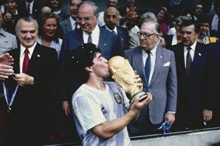 1986年世界杯颁奖仪式上,马拉多纳亲吻大力神杯