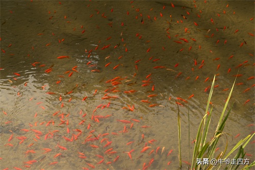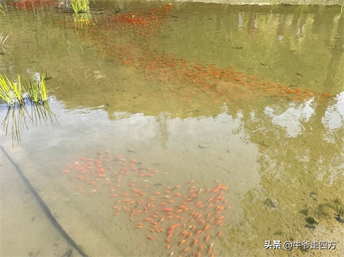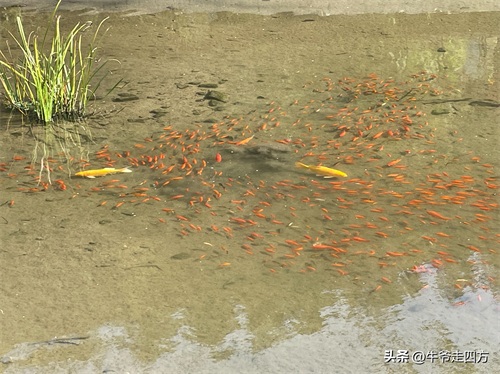 白水沿着山势从东向西流淌,然后拐向南向。转弯处水中有许多红色小鱼,时而排队前行,时而一团一簇。