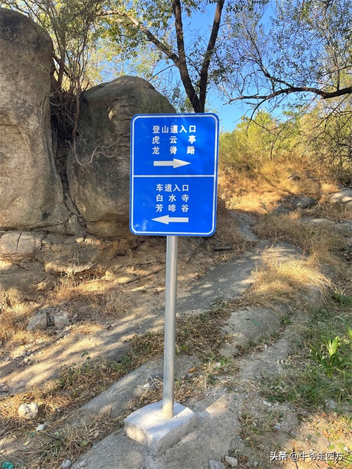 进了山口的路右侧,立着在一块指示牌,标明直行是车道入口,可直接到达白水寺;右侧是登山道入口,走龙脊路,到虎云亭。既然已经停好了车,索性就登山吧。于是顺着右侧的土路奔了登山道的入口。