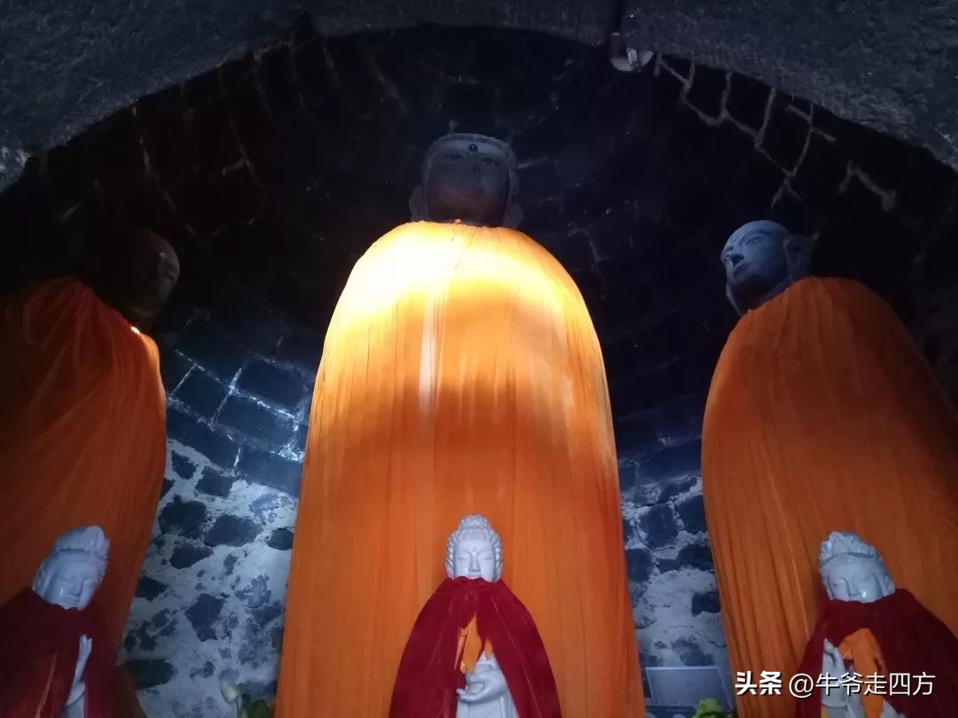 “石阁”内三尊石佛,背北向南合掌垂目,立于盘形石雕莲花座上。石佛是由花岗岩雕刻而成,中间为释迦牟尼佛,5.8米。螺髻,无高肉髻;面部丰圆,两耳垂肩,身着袈裟,两手持印,微露足尖,脚踏椭圆形莲座。两旁二胁侍,左阿难,右迦叶。前者双手合十,后者合撑弯指,均两耳垂肩,身着迦裟,亦路椭圆形莲座。