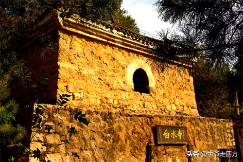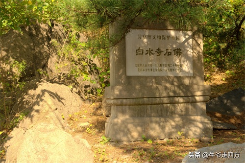 顺着公路向西行走不远,是一个生态停车场。如果只为了游览白水寺,可开车从西北山口处直接开进来,到此停车。过了停车场顺着岔路往右前方走,就是通往白水寺的山路。从公路与白水寺交界的路口前行,大约8-9分钟的时间就到达了白水寺。路旁立有北京市文物局所立的“白水寺石佛”的文保碑。