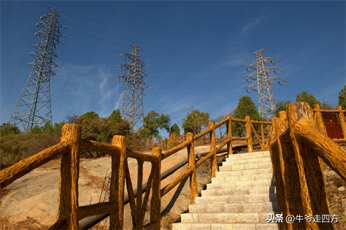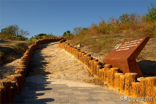 绕过“空悬观潮”向右登山,山路明显有所爬升。继续走了不足十分钟,到达了一个山梁。路边的景观牌提示为“山隔因堤”景观。