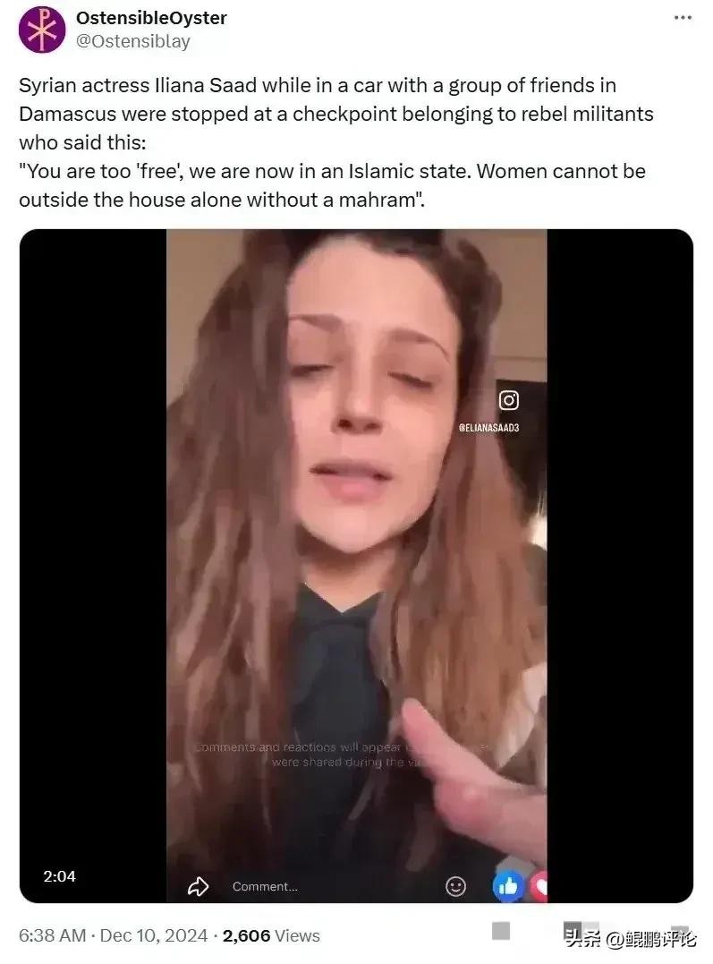 这才没几天,也不用说将来了,已经有叙利亚女性开始哭诉了。叙利亚有个挺有名的演员叫伊利亚娜 萨阿德,她前几天学着西方的样子在网上高喊“这是兹油皿煮的历史时刻!”