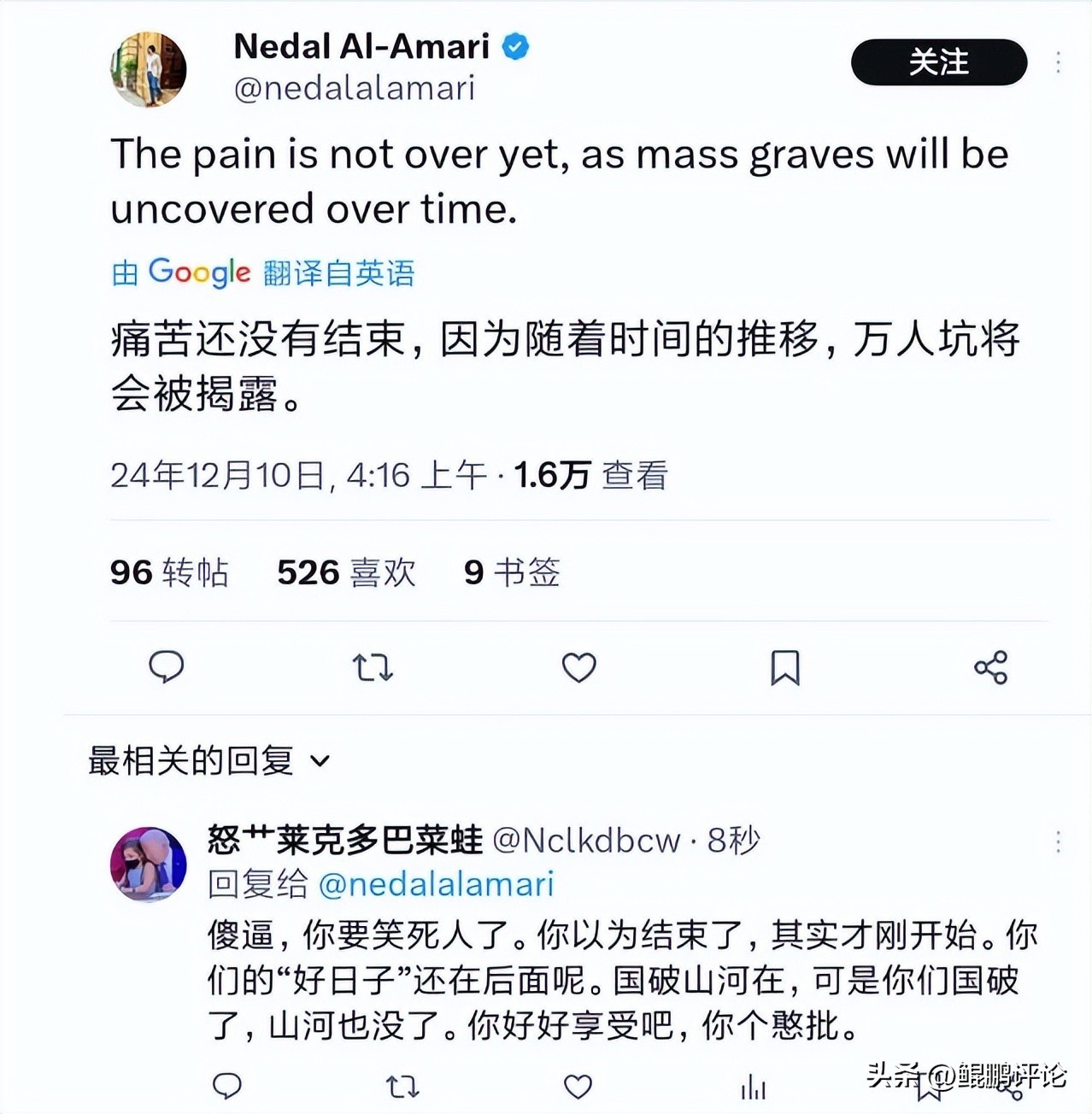 还有一个比较具有代表性的人,是叙利亚的一个挺有名的记者。他在x上的认证是蓝标呢,发帖的阅读量不小。按理说,记者走南闯北的,见识不少,应该不会那么容易被忽悠才对。但实际上,这位实在是天真的可以。