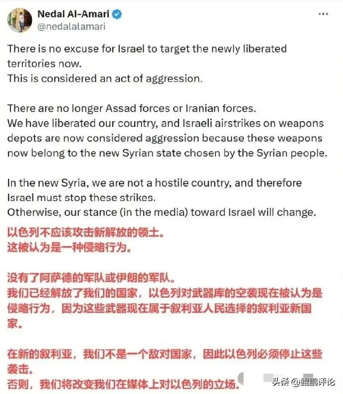 现在,叙利亚的一切,都属于叙利亚人民了。以色列不应该攻击新叙利亚,否则的话,我们这些新叙利亚人,可就要改变对以色列的立场了哦!就问你怕不怕吧?