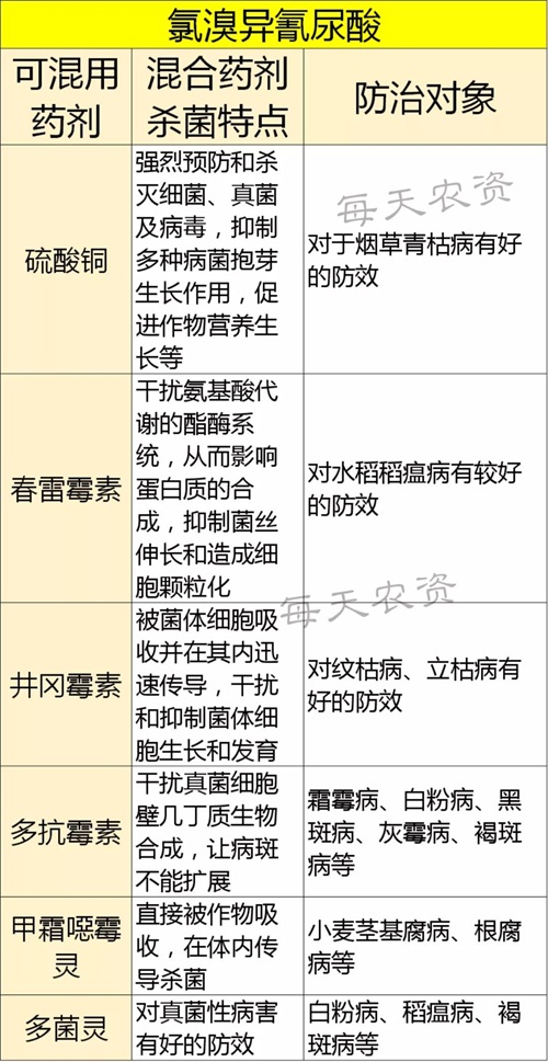 再次强调下,氯溴异氰尿酸除了有机磷、碱性农药外,别的药剂基本上都可以混配使用。