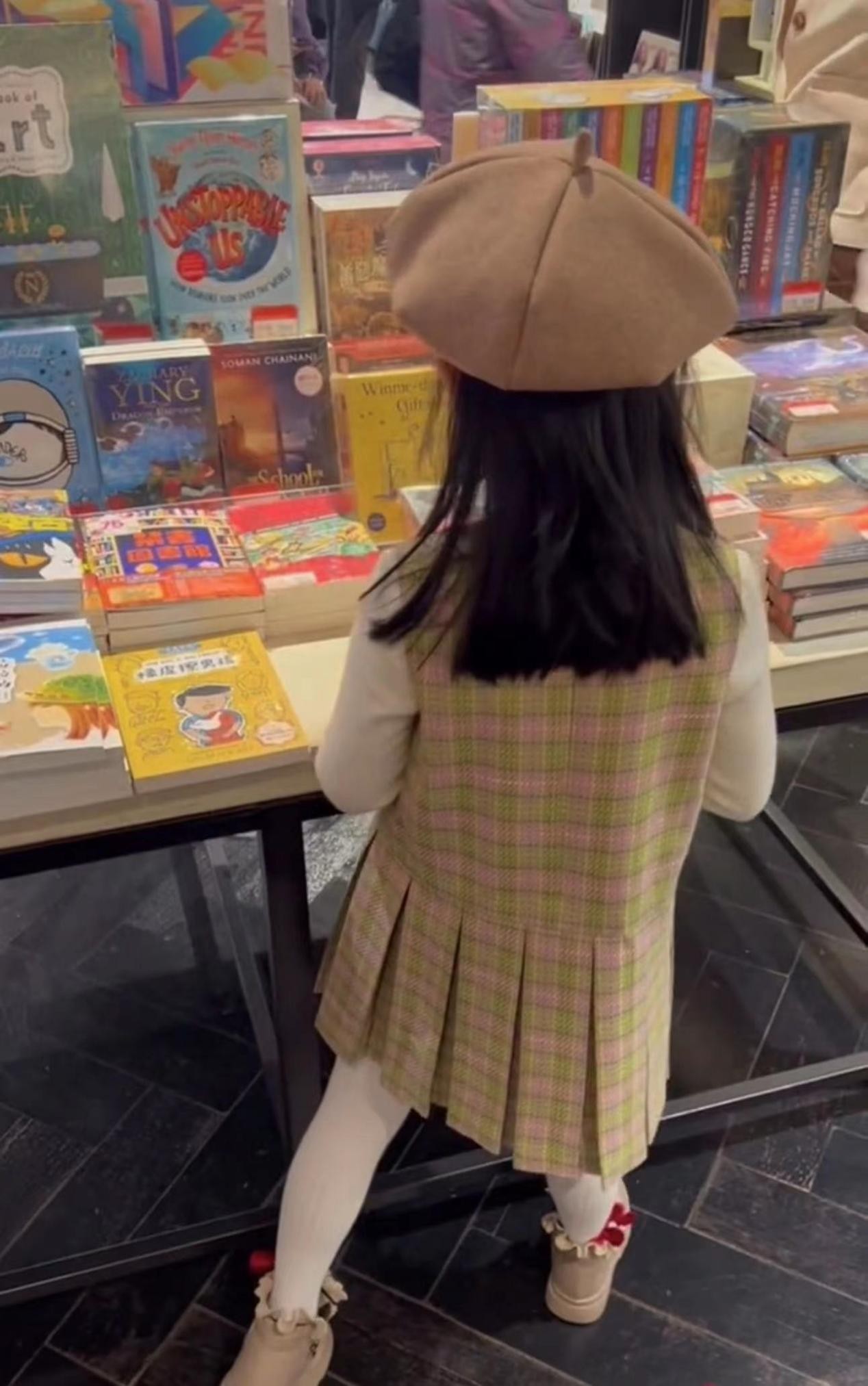 除了在茶餐厅吃饭外,小米粒还跟妈妈来到书店选购儿童读物,她在书架前认真选购的模样也是非常的可爱,又想骗人生女儿。