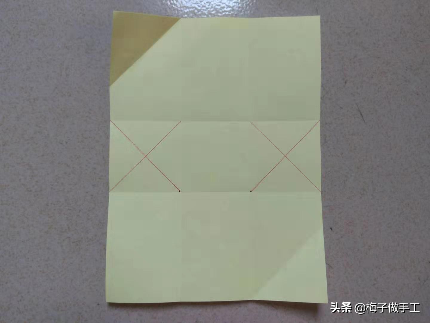 第二步:把左上角的角向第一条折痕翻折,然后把剩下部分朝这个角对折,再展开得到折痕;另一端折法相同。