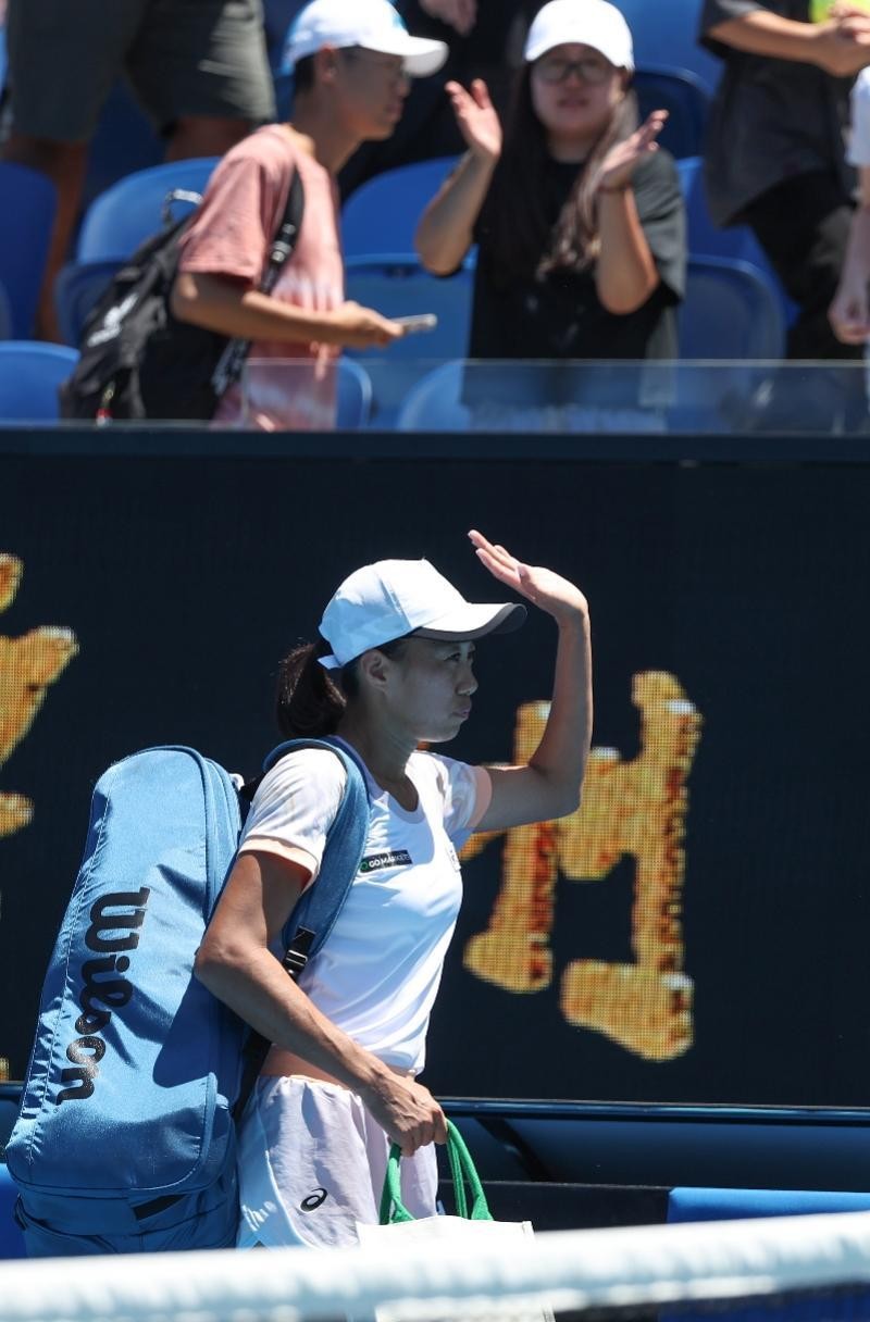 新华社照片,墨尔本(澳大利亚),2025年1月23日 (体育)(6)网球——澳网:张帅无缘八强 1月23日,张帅在赛后离场时向观众致意。 当日,在墨尔本进行的澳大利亚网球公开赛女子单打第四轮比赛中,中国选手张帅以0比2不敌捷克选手普利斯科娃,无缘八强。 新华社记者 白雪飞 摄