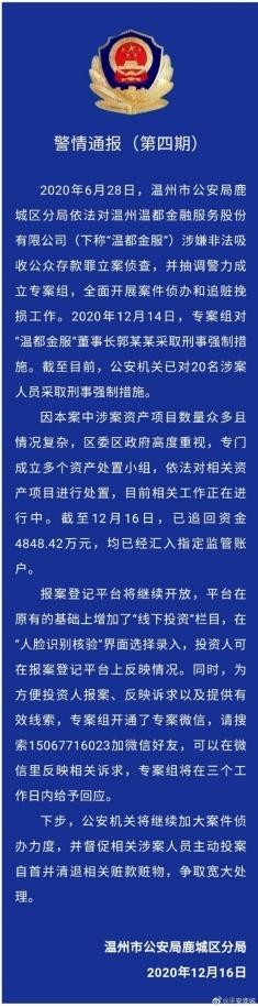 鲁网·泰山财经12月16日讯(记者 于雅雯)16日,温州市公安局鹿城区分局官方公号“平安鹿城”发布警情通报,自6月28日对温州温州温都金融信息服务股份有限公司(以下简称“温都金服”)以涉嫌非法吸收公众存款罪立案侦查以来,已对20名涉案人员采取刑事强制措施,追回资金4848.42万元,均已经汇入指定监管账户。